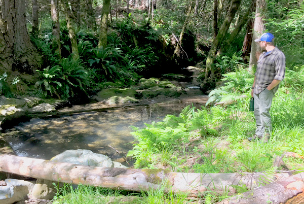 Galen Doherty, Lands Manager for Sanctuary Forest, gazes over the log step pool structures he helped install on Baker Creek.